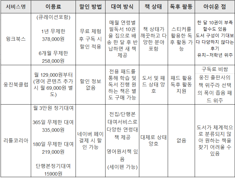 웅진북클럽 - 패드 학습도 있고, 독후활동, 큐레이터도 다양하게 활용할 수 있지만, 가격이 비싸고, 가격체계가 어려움.