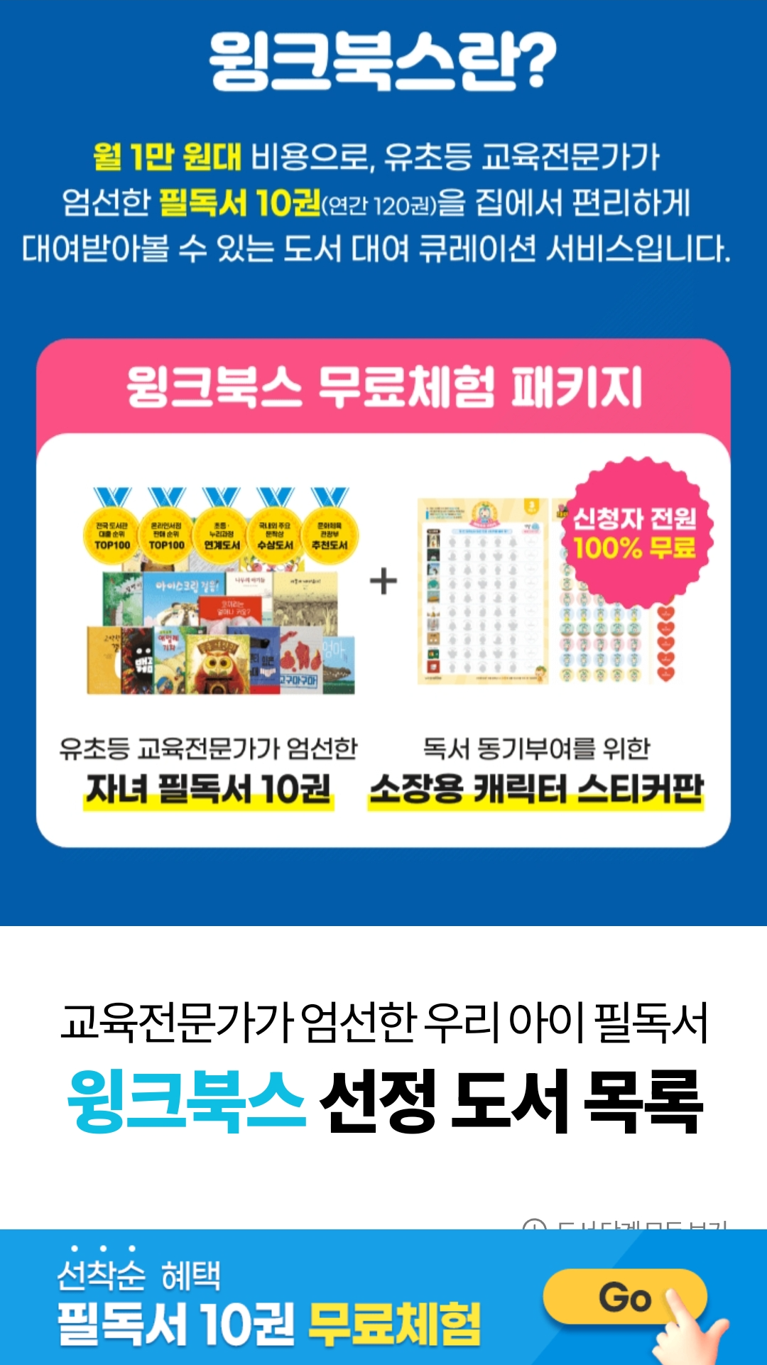 초등학생이라 고민이 되던 두가지 중에 일단 윙크북스는 무료체험이 있길래 바로 신청했답니다. 리틀코리아는 어릴적부터 전집 박스책으로 몇번 빌려왔던 곳이라서 단행본 세트도 빌릴수 있길래 고민하고 있었거든요
