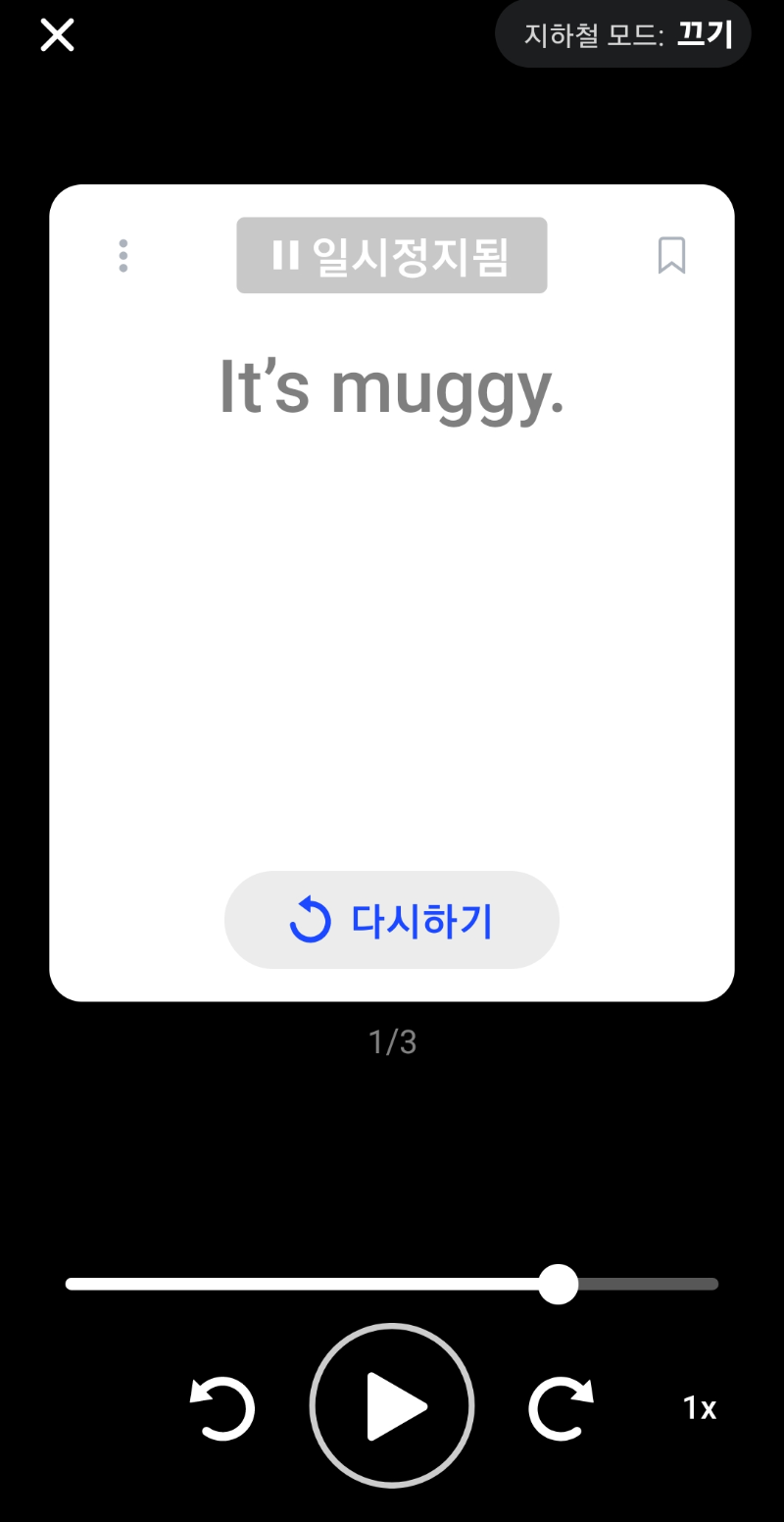 처음에는 글씨를 보여주고, 다음번에는 글씨를 가리고 (지하철 모드를 켜면 발음연습 안해도 알아서 다음으로 넘어가요)