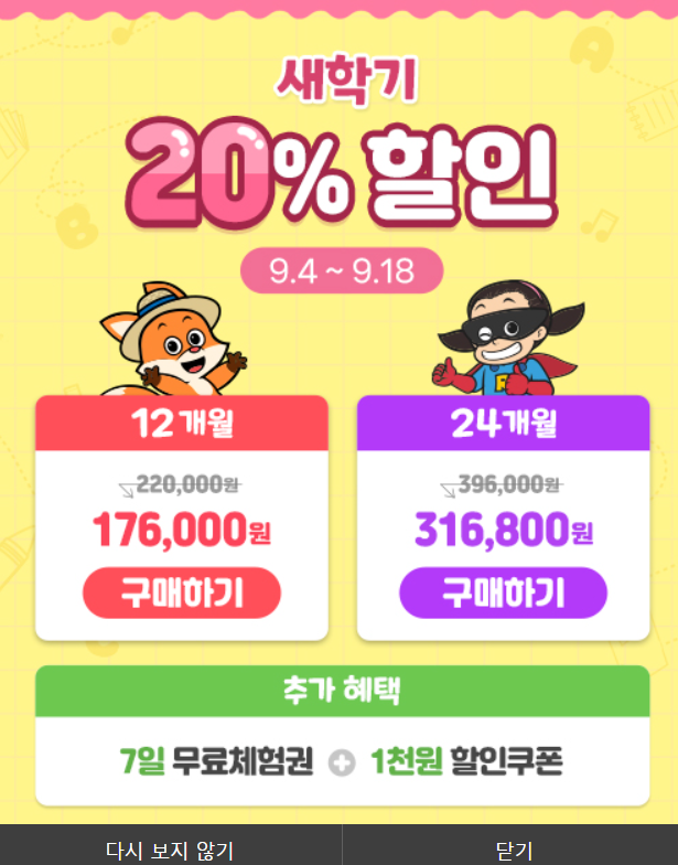 | 기간 | 정가 | 프로모션(예: 새학기 20%) |