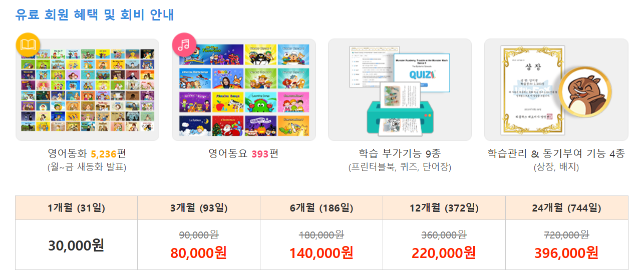 - 영어 동화 5,236편 + 영어 동요 393편: 월~금 신규 업데이트로 지루할 틈이 없음