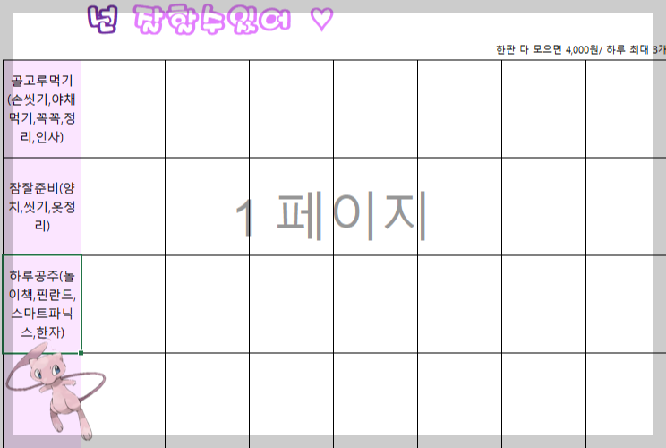 버전 3 : 프린터도 망가져서 마침 칼라프린트를 샀었기 때문에, 좋아하는 캐릭터 검색해서 같이 프린트해 주었습니다. 이때는 티니핑에 빠져있다가 피카추에 빠져있다가, 지금은 컸다고 캐릭터 같은 건 안 넣고 있습니다. 이젠 색칠도 귀찮아해서;;;그냥 날짜만 바꾸는 식으로 해야해서 엑셀파일로 관리하고 있습니다.