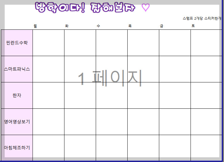 큰딸이 7살 전까지는 생활습관 칭찬스티커판을 사용했는데, 방학기간에는 집에 있는 시간이 많기 때문에 학교 가기 전에 공부습관을 잡아서 앉아서 집중할 수 있는 시간을 늘리고 싶었습니다. 그래서 첫째만 위클리로 스탬프판을 추가로 해서, 칭찬스티커판에 인센티브같이 추가해서 사용했습니다. 위클리판에는 학습 관련 활동만 기록하고, 공부 한 개를 할 때마다 스탬프를 찍어주고, 주 단위로 정산했습니다.