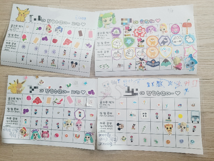 아직 어린아이의 경우에는 생활습관을 어떤 걸 바르게 잡아줄 것인지 생각하고 기준을 잡는 것부터 시작합니다. 부모님마다 다른 기준을 가지고 있기때문에 각자 생각하시는 게 제일 좋은 방법인것 같아요. 저는 7살까지는 많이 놀게하고 싶어서 한글도 안 가르치고, 책만 읽어줬는데, 여자아이들이라 그런지 한글은 유치원에서 가르쳐주는 정도로 알아서 떼었습니다그래서 칭찬스티커판의 시작은 생활습관을 잡기로 목표로 했습니다. 저의 경우에는 잘 먹고, 잘 자고, 그리고 추가 공부 습관을 잡는 걸 목표로 잡았어요 1) 잘 먹고의 기준 손 씻고, 야채 등 골고루 먹고, 꼭꼭 씹어먹고, 다 먹은 그릇 싱크대에 정리하고, 잘 먹었습니다 인사하는 것을 모두 해야 스티커 1개2) 잘 자고의 기준 양치하고 , 손발 씻고, 잠옷 갈아입고 나서 오늘 입은 옷정리(빨래통에 넣기)를 모두 해야 스티커 1개 3) 공부습관 놀이책이나 7살이었던 첫째는 수학, 영어 파닉스, 한자공부 중에 한 챕터를 하면 추가로 스티커 1개