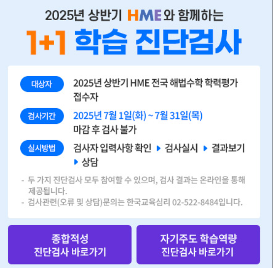 오랜만에 홈페이지에 들어가봤는데, 2025 HME 상반기 종합적성 진단검사를 신청해봤습니다. 상반기 HME 전국 해법수학 학력평가 접수자 대상이라 뭔가 싶어서, 체험 삼아 해보자는 마음으로 시작했죠.