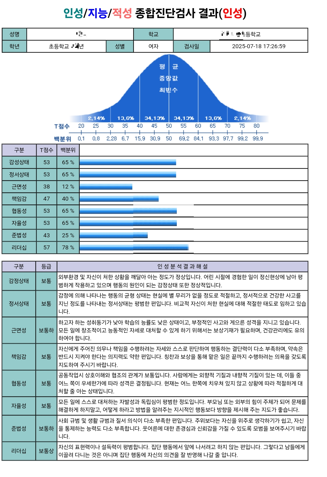 인성 영역에선 리더십이 꽤 높게 나왔고, 협동성과 자율성은 평균이었어요. 다만 근면성과 준법성은 다소 낮은 편으로 나와서, 이 부분은 앞으로의 생활습관 개선에 참고하면 좋겠다 싶었습니다.