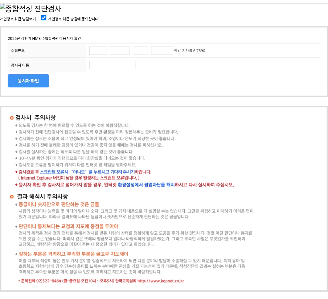 종합적성 진단검사는 상반기 HME 전국 해법수학 학력평가 접수자 대상이기때문에 수험번호를 적어야 할 수 있답니다